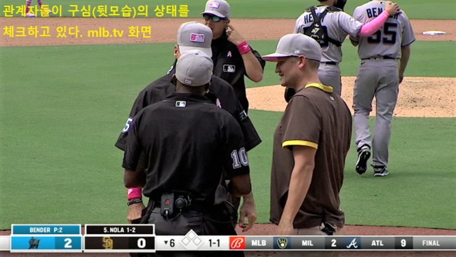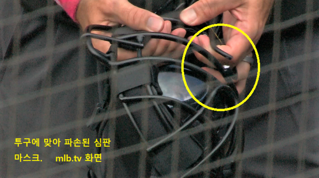 와중에 MLB의 레벨을 실감케 하는 장면이 있다. 마스크의 상태다. 97.5마일과의 정면 충돌로 철제(혹은 강화 플라스틱 재질) 보호대가 파손되고 말았다. 때문에 장비 교체로 중단 시간이 길어졌다. 이어 가해자(포수)의 가벼운 사과, 피해자의 소박한 미소로 해프닝은 끝났다.