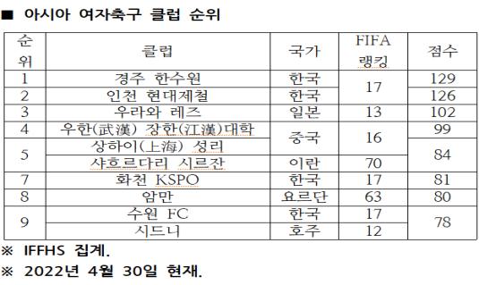 이 같은 한국 여자축구의 뚜렷한 상승세를 읽을 수 있는 자료가 발표됐다. IFFHS(국제축구역사통계연맹)가 지난 9일(현지 일자) 내놓은 대륙연맹별 여자 클럽 랭킹 AFC(아시아축구연맹) 톱 10에서, 한국은 초강세를 보였다. 한국은 1·2위를 비롯해 4개 팀이 1~10위 반열에 올랐다(표 참조).