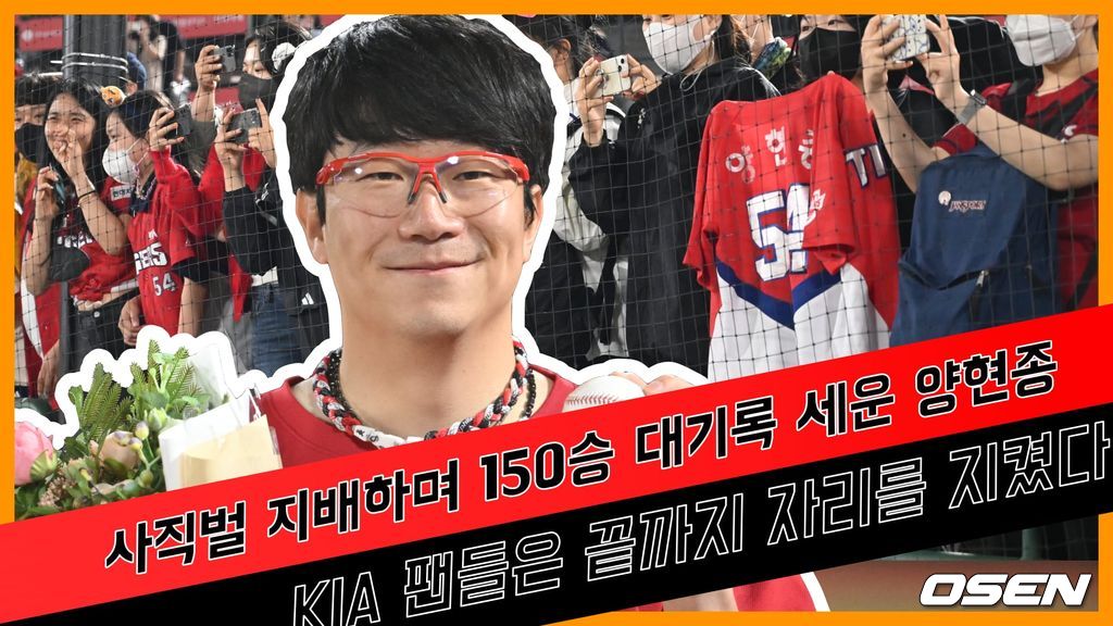 KIA 타이거즈 양현종이 통산 150승 대기록을 달성했습니다. KIA 타이거즈의 살아있는 역사가 된 양현종은 19일 부산 사직구장에서 열린 롯데 자이언츠와의 경기에 선발 등판해 7.2이닝 동안 삼진 3개를 낚아내며 홈런 1개 포함, 4안타 1볼넷 2실점으로 호투, 팀의 4-2 승리를 이끌었습니다. 시즌 3승. 통산 150승 기록입니다. 이는 송진우(210승), 정민철(161승), 이강철(152승)에 이은 KBO리그 역대 4번째 기록이자 역대 최연소(만 34세 2개월 18일) 기록입니다. 정민철이 가지고 있던 35세 2개월 27일의 기록을 넘어선 겁니다. 지난 2007년 한화 정민철 이후 15년 만에 나왔고 KIA 소속으로는 2004년 이강철 이후 두 번째입니다. 이날 경기는 1회 말 2사 2루 상황에서 이대호가 양현종의 초구 129km 슬라이더를 걷어 올려 좌월 선제 투런포를 쏘아 올렸습니다. 시즌 6호포. 하지만 KIA가 2회 초 롯데 투수 이인복의 1루 송구 실책 때 2루 주자가 득점했고 이어진 무사 1, 3루에서 류지혁이 중전 적시타를 뽑아내며 2-2 동점을 만들었습니다. KIA는 5회 초 1사 후 박찬호가 행운의 우전안타로 출루했고 김선빈의 3루수 땅볼로 2사 2루를 만들더니 나성범이 우익수 방면 적시타를 때려내면서 3-2로 앞서갔습니다. 그리고 KIA는 9회 초 2사 후 이창진이 좌월 솔로포를 쏘아 올리면서 승부에 쐐기를 박았습니다. 나성범이 역전 결승타, 이창진이 쐐기포를 쏘아 올렸고 외야수 소크라테스, 이창진 등이 호수비로 양현종의 승리를 도왔습니다. 김선빈은 기록 달성에 쓰인 공을 챙겨 왔고 김종국 감독은 축하 꽃다발을, 후배들은 방송 인터뷰가 끝나자 축하 물세례를 퍼부어 양현종의 150승 대기록을 축하했습니다. 팬들은 양현종이 보이지 않을 때까지 자리를 뜨지 않고 지켰습니다. / foto0307@osen.co.kr