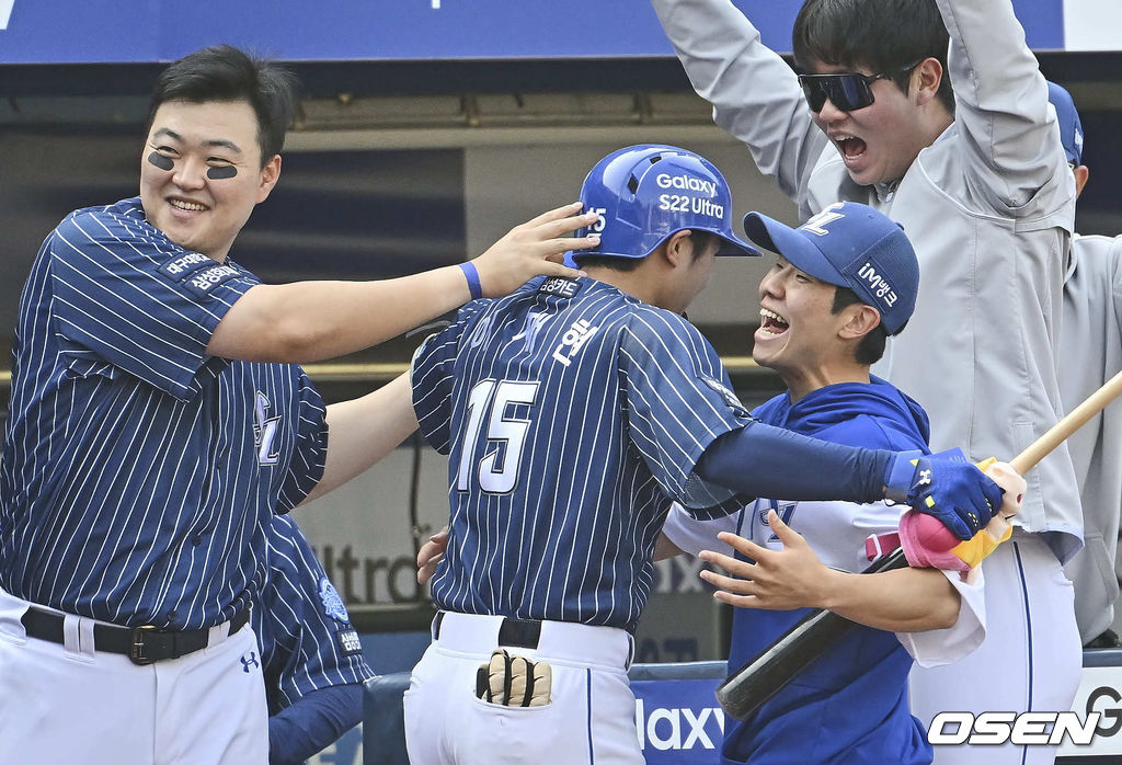 담 증세로 출전을 못한 구자욱도 세이브를 기록한 우규민도 실책과 무안타를 기록한 포수 강민호도 이재현의 홈런을 격하게 축하 했다. / foto0307@osen.co.kr