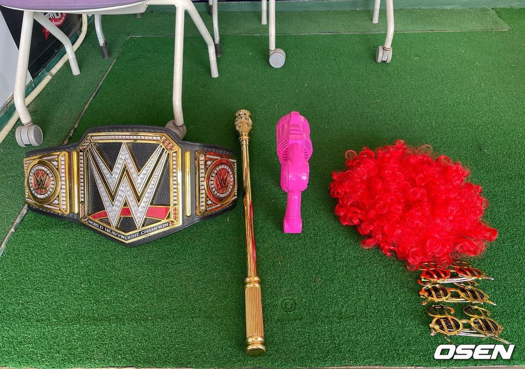 그런데 지난 주 잠실 LG 시리즈부터 새로운 아이템이 추가됐다. WWE 프로레슬링에서 쓰는 챔피언 벨트 모형이다. 이제 홈런을 친 선수들은 허리춤에 챔피언 벨트까지 착용한다.