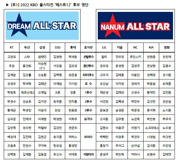 오는 7월 16일(토) 잠실에서 개최되는 2022 KBO 올스타전은 드림 올스타(KT, 두산, 삼성, SSG, 롯데)와 나눔 올스타(LG, 키움, NC, KIA, 한화)로 팀을 나눠 구성되며, 각 구단이 포지션별로 추천한 후보 총 120명 중, 양 팀의 ‘베스트12’ 총 24명을 선정한다.