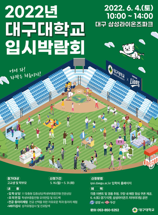 삼성 라이온즈는 오는 4일(토) 대구 삼성 라이온즈파크(이하 라팍)에서 지난해에 이어 두 번째로 대구대학교 입시박람회를 진행한다.