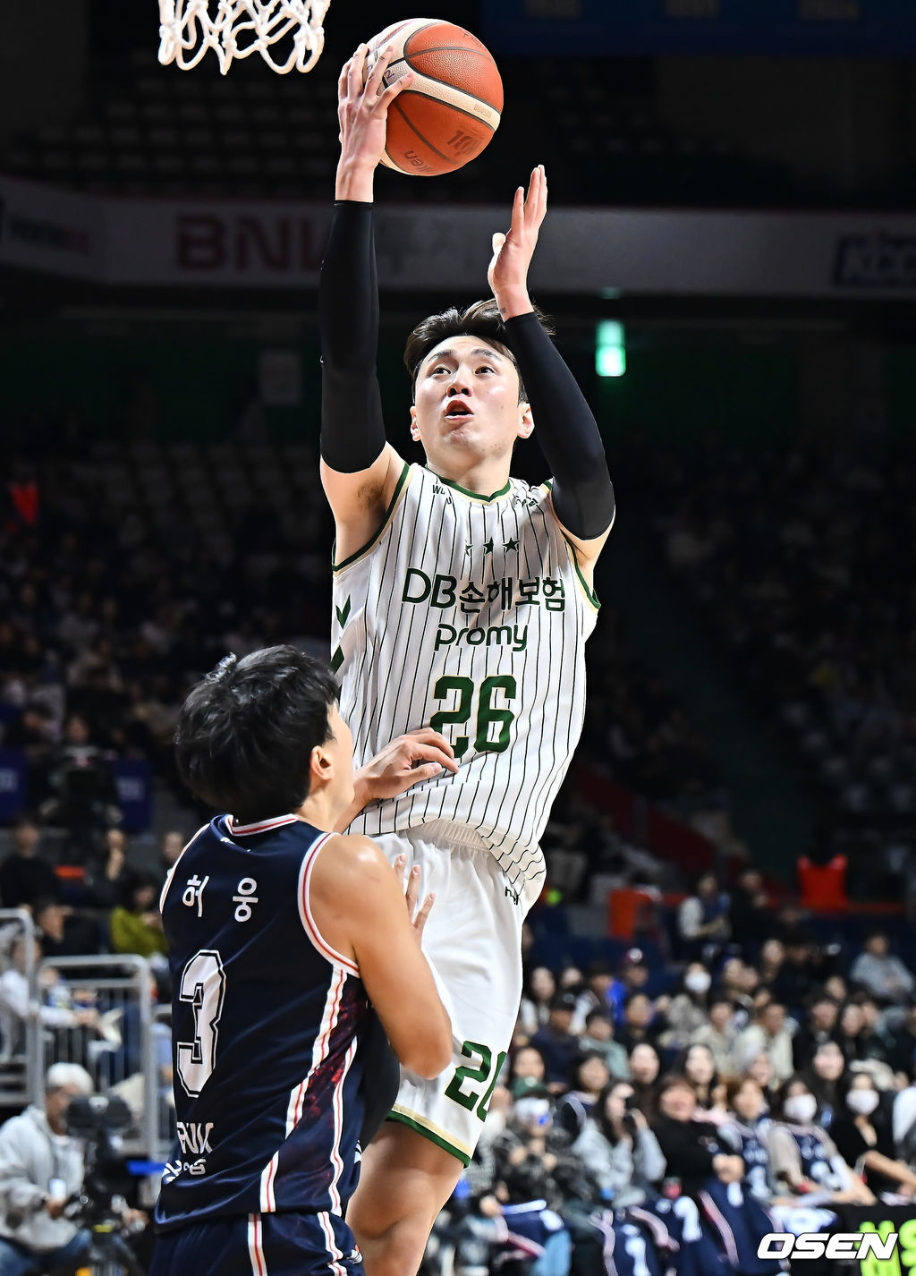 원주 DB 강상재가 부산 KCC 허웅의 마크를 피해 골밑슛을 시도하고 있다. 2025.12.06 / foto0307@osen.co.kr