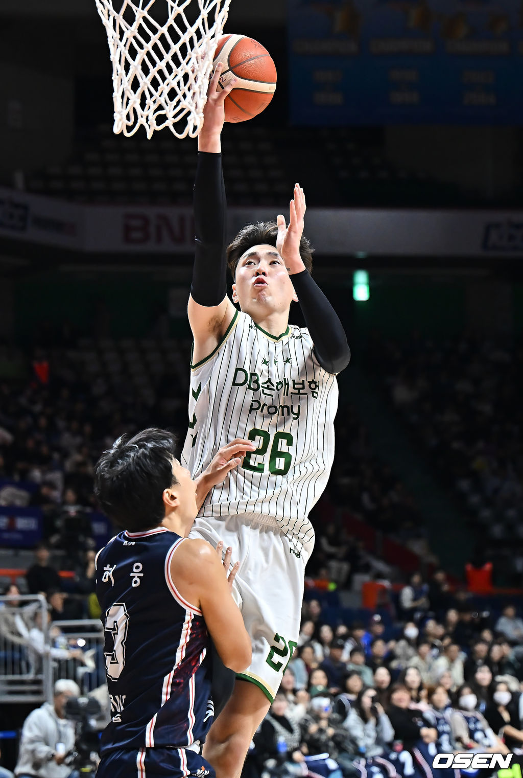 원주 DB 강상재가 부산 KCC 허웅의 마크를 피해 골밑슛을 시도하고 있다. 2025.12.06 / foto0307@osen.co.kr