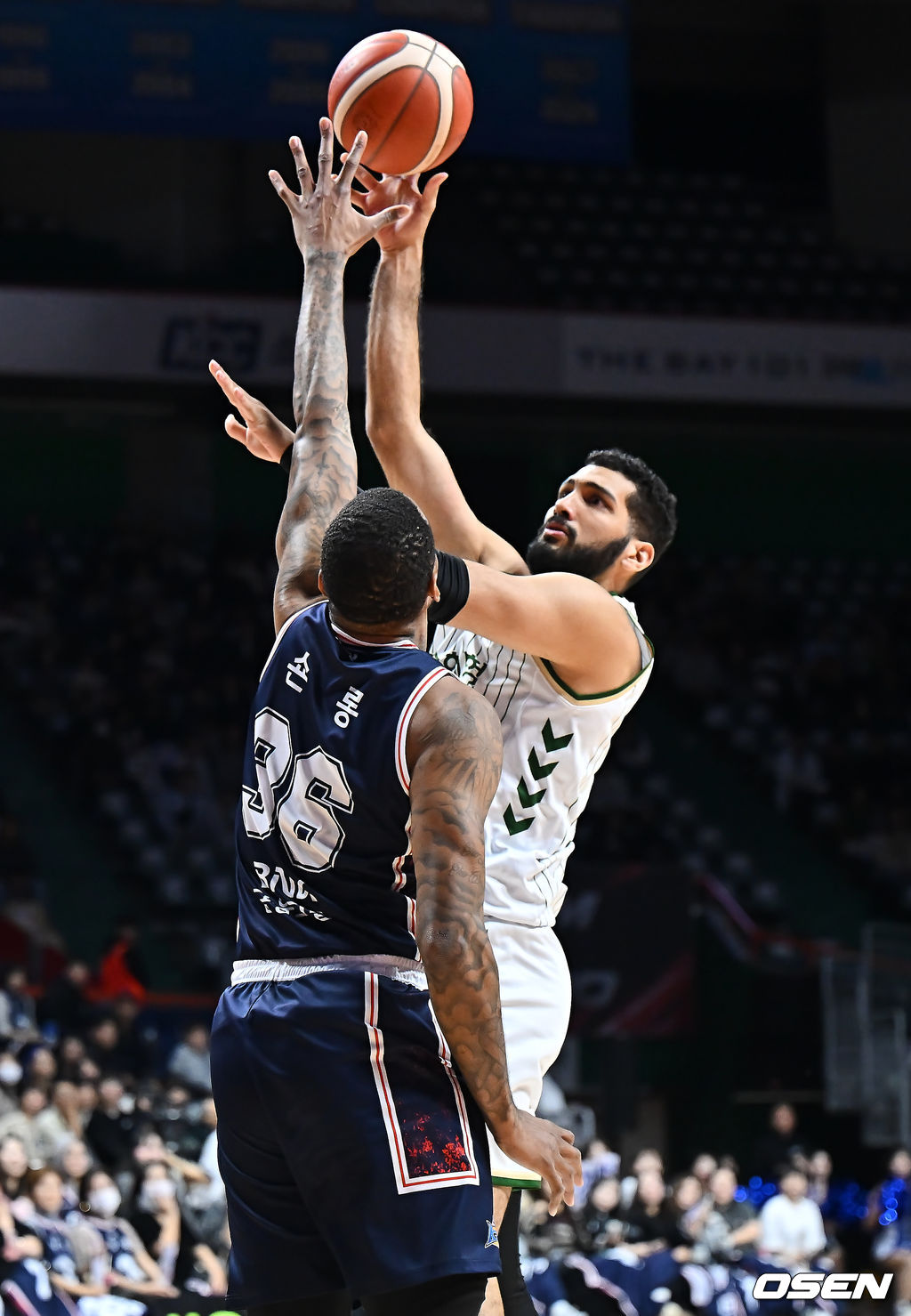 원주 DB 에삼 무스타파가 부산 KCC 숀롱의 마크를 피해 골밑슛을 시도하고 있다. 2025.12.06 / foto0307@osen.co.kr
