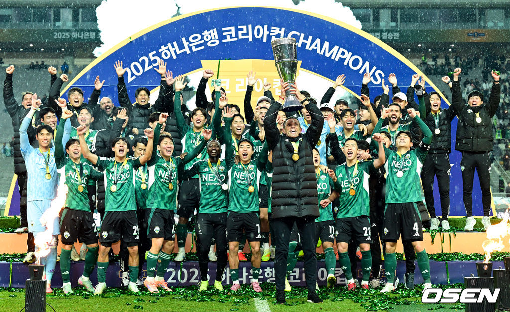 K리그1 우승에 이어 코리아컵 우승까지 더블을 이뤄낸 전북이 우승 세리머니를 하고 있다. 2025.12.06 /cej@osen.co.kr