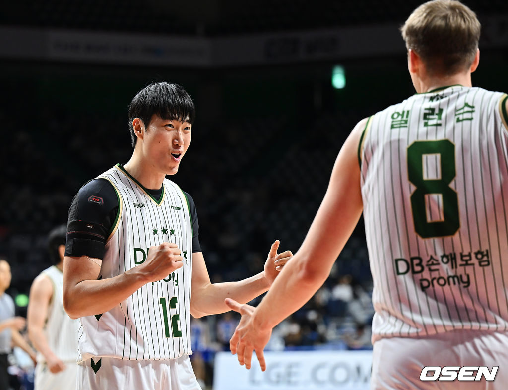 원주 DB 정효근이 득점에 추가 자유투 까지 얻어낸 엘런슨을 보며 환호하고 있다. 2025.12.06 / foto0307@osen.co.kr