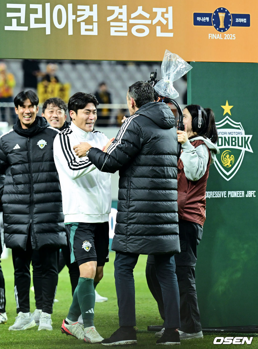 코리아컵 MVP로 선정된 전북 박진섭이 포옛 감독의 축하를 받고 있다. 2025.12.06 /cej@osen.co.kr