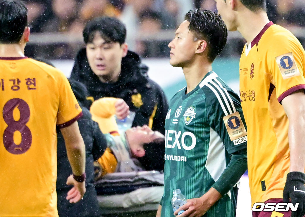연장 후반 전북 이승우가 광주 권성윤을 향한 파울로 퇴장 당하고 있다. 권성윤은 구급차로 실려갔다. 2025.12.06 /cej@osen.co.kr