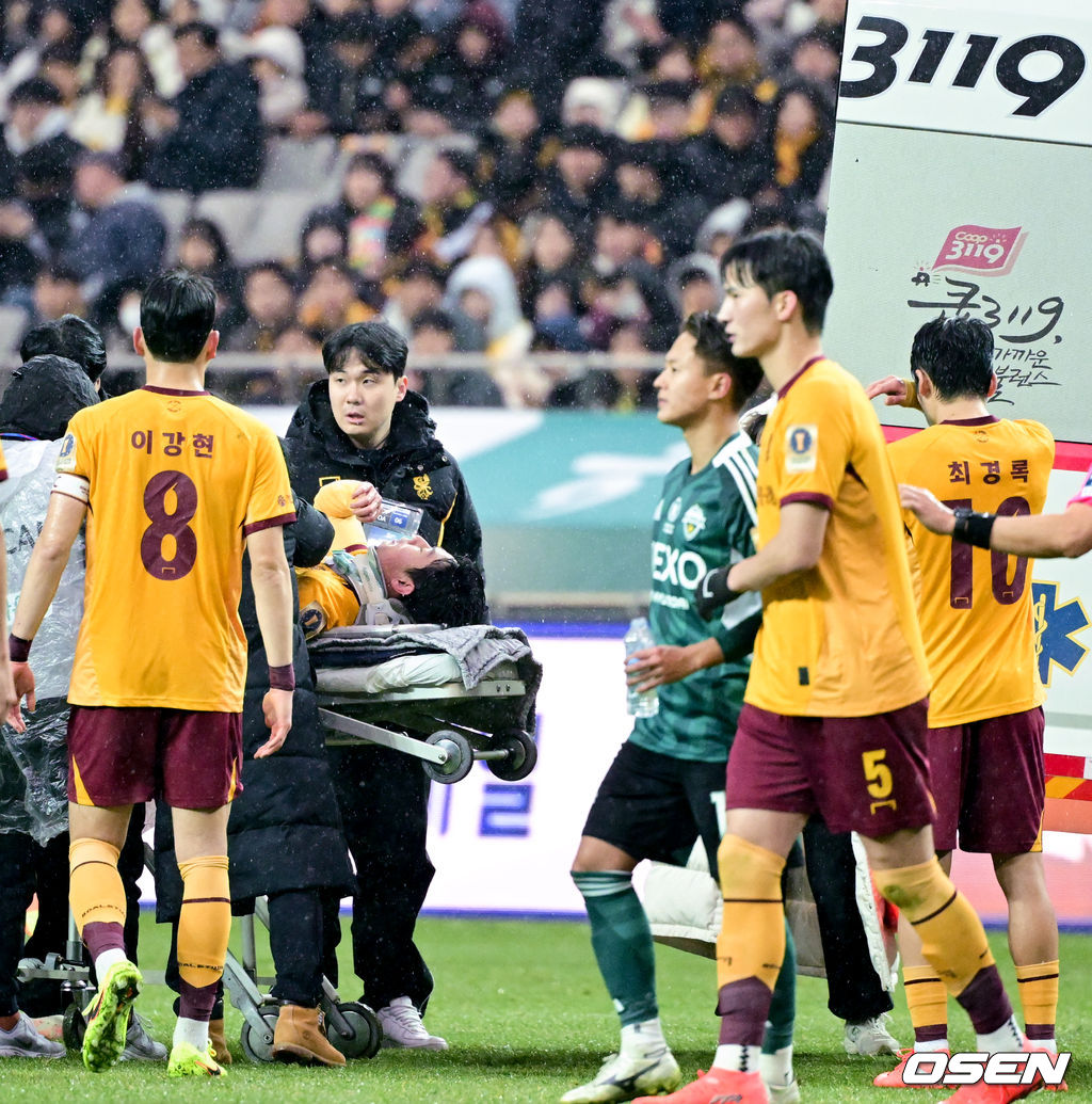 연장 후반 전북 이승우가 광주 권성윤을 향한 파울로 퇴장 당하고 있다. 권성윤은 구급차로 이송됐다. 2025.12.06 /cej@osen.co.kr