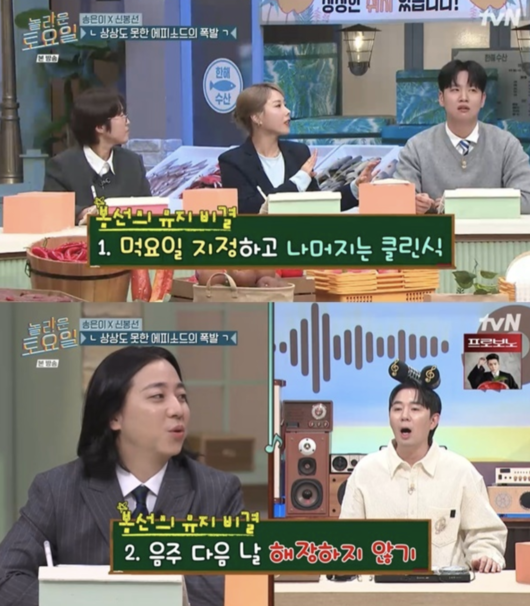 신봉선은 “요일을 정해놓고 먹고 나머지 날은 클린하게 관리한다. 술 마신 뒤 해장하지 않는 것도 중요하다”고 강조해 눈길을 끌었다.