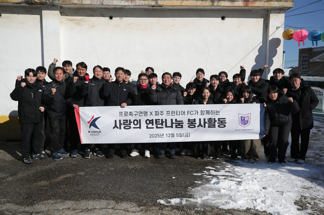 같은 날 오후 연맹과 파주프런티어FC 임직원 34명은 파주 지역 취약계층을 위한 연탄 나눔 활동을 진행했다. 이 자리에는 연맹 박성균 사무국장, 파주프런티어FC 김정열 이사장, 황보관 단장, 파주시 체육과 관계자 등이 참여했다.