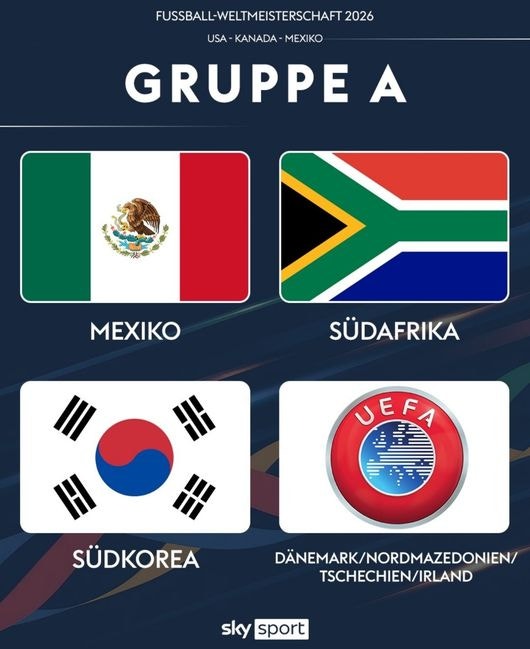 홍명보 감독이 이끄는 한국은 A조에 배정되면서 공동 개최국 멕시코, 남아프리카공화국, 그리고 덴마크·북마케도니아·체코·아일랜드 중 한 팀이 될 유럽 예선 플레이오프 D 승자와 함께 묶이게 됐다.
