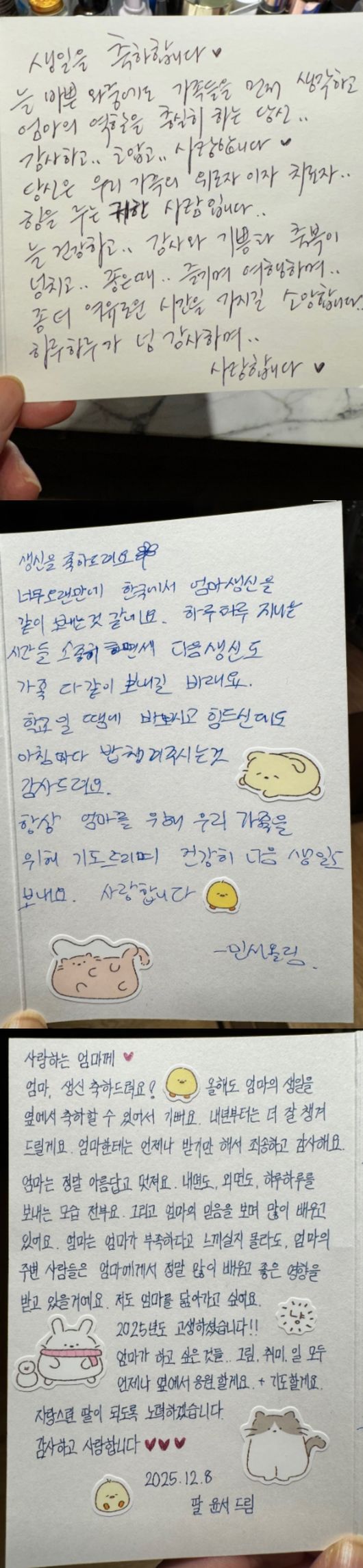 또한 아들 민서 군은 "다음 생신도 가족 다 같이 보내길 바란다. 학교 일 때문에 바쁘시고 힘드신대도 아침마다 밥 챙겨주시는 것 감사드린다. 항상 엄마를 위해, 우리 가족을 위해 기도 드리며 건강히 다음 생일 보내요. 사랑합니다"라고, 딸 윤서 양은 "엄마한테는 언제나 받기만 해서 죄송하고 감사하다. 엄마는 정말 아름답고 멋지다. 내면도 외면도 하루하루를 보내는 모습 전부. 엄마의 믿음을 보며 많이 배우고 있다. 엄마는 엄마가 부족하다고 느끼실지 몰라도 엄마의 주변 사람들은 엄마에게서 정말 많이 배우고 좋은 영향을 받고 있을 거다. 저도 엄마를 닮아가고 싶다"라고 덧붙여 뭉클함을 더했다.