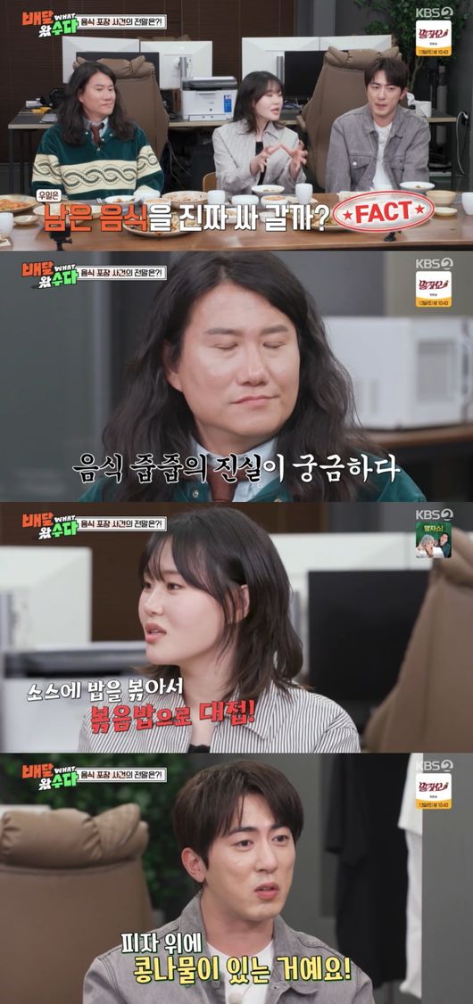 이때 김원훈은 “나는 산증인이다”라며 “저는 우일 선배가 집에 가서 피자를 데워서 줬는데 피자 위에 콩나물이 있더라”라고 밝혔다. 이영자는 “말하지마”라고 기겁했고, 김원훈은 “피자에 콩나물 토핑이 없지 않나. 솔직히 이야기하면 나도 그냥 인정하고 먹을텐데 원래 있다고 하더라”라고 분노했다.