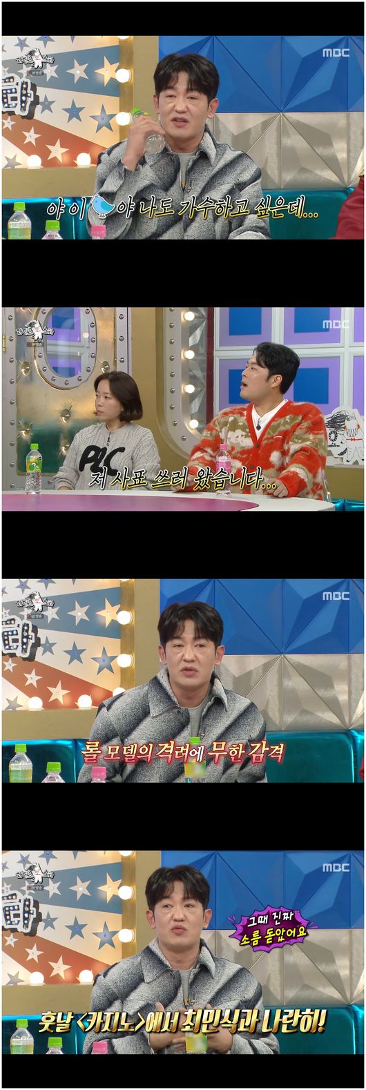 허성태는 “최민식 선배님 연기로 준비를 했는데, ‘카지노’에서 최민식 선배님이랑 만났다. 애드리브로 쌍욕을 막 했는데 최민식 선배님께서 ‘성태야, 나이스!’라고 하시더라. 너무 소름이 돋았다”라며 “목동에서 거제도로 내려가는 동안 5시간 동안 오디션을 볼 것인지, 각오를 했다. 내려가서 사표를 쓴다고 하고, 오디션 합격했다고 말해줬다. 보름 이후 합숙을 해야 하니, 연기 학원을 가려고 하고, 막 나갔다”라며 한때 연기의 꿈을 가지며 도전했던 과거를 전했다.