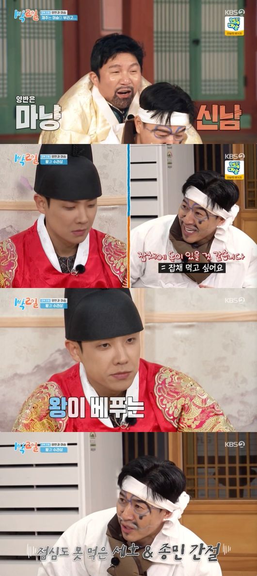 결국 딘딘의 활약으로 이준이 왕이 됐다. 이준은 왕이 되면서 저녁 수라상을 받을 수 있었고, 양반 조세호와 문세윤, 노비 딘딘과 김종민, 유선호는 밥만 먹을 수 있었다.