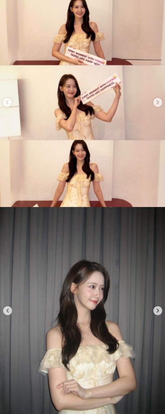공개된 사진 속 윤아는 커튼 사이에 선 채 연한 골드 톤의 오프숄더 드레스를 입고 청초한 분위기를 발산하고 있다. 어깨 라인이 자연스럽게 드러나는 디자인과 잘록한 허리선이 어우러지며 특유의 우아한 실루엣을 완성했다.
