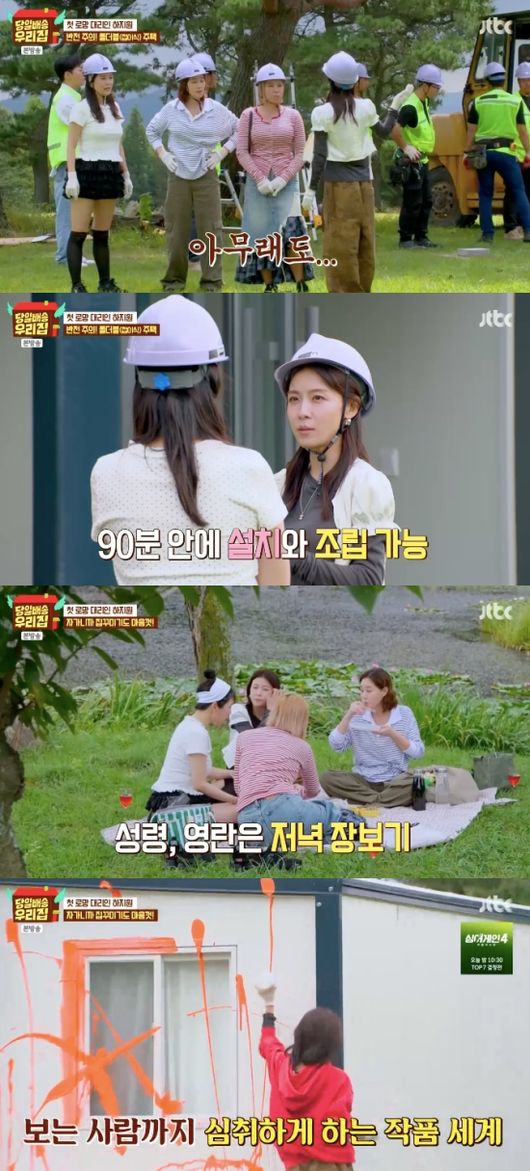 식사를 마친 이들은 둘씩 조를 지어 움직이기로 했다. 하지원과 가비는 집의 외벽을 페인트로 꾸미기로 했고 장영란, 김성령은 장을 보기로 했다. 가비가 차분하게 그림을 그리는 반면 하지원은 페인트 통을 들고 역동적으로 움직였다. 멤버들 이름까지 적자. 완벽한 집이 완성되었다.