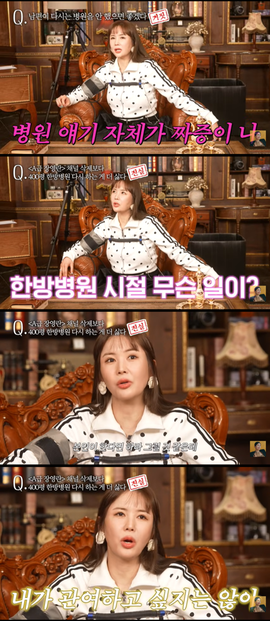 장영란은 이어 "다시는 남편이 병원을 한다면 뜯어서라도 말릴 것 같다"고 강조하면서도, "본인이 하겠다면 하라고 하겠지만 나는 절대 관여하고 싶지 않다"며 병원 경영에서 완전히 손을 떼겠다는 강한 의지를 내비쳤다.