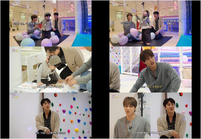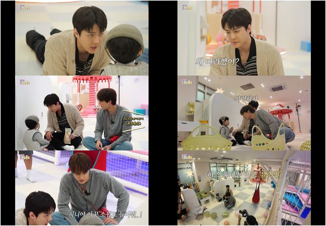 이들은 아기 천사로 불리는 이진이를 보고 웃음을 감추지 못했다. 그러면서도 세훈은 "이진이 어디 있어!"라고 위풍당당하게 외쳤으나, 장난감을 카이에게 건네며 방싯 웃는 이진이를 본 이들은 사르르 녹는 미소를 보였다. 이어 29개월 아기 특유의 사랑스러운 향기에 카이는 "아기 꼬순내 난다. 땀 났을 때 정말 좋은 냄새가 난다"라며 어쩔 줄 몰라 했고, 세훈은 "난 이따 발 입에 넣고 와랄라 할 거다"라며 비장하게 말해 웃음을 안겼다. 실제로 이들은 이진이 테라피를 실천하며 이진이를 살폈다.