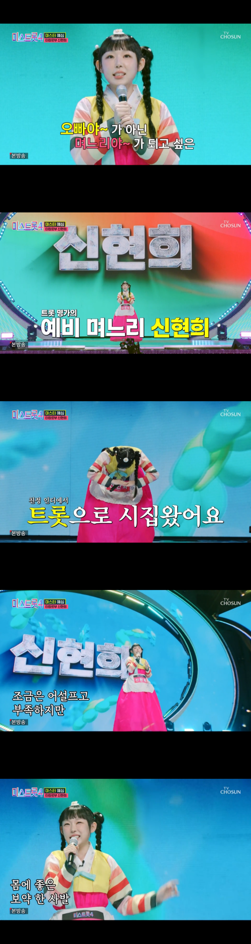 독특한 음색과 개성으로 잘 알려진 신현희의 트롯 도전에 현장은 이내 집중 분위기로 바뀌었다. 그가 선택한 곡은 ‘며느리’. 무대 시작과 동시에 “국민 며느리가 되고 싶은 신현희입니다”라고 외치며 분위기를 끌어올린 그는 특유의 독특하면서도 애교 섞인 음색으로 무대를 장악했고, 심사위원들의 하트를 이끌어내며 올하트에 성공했다.