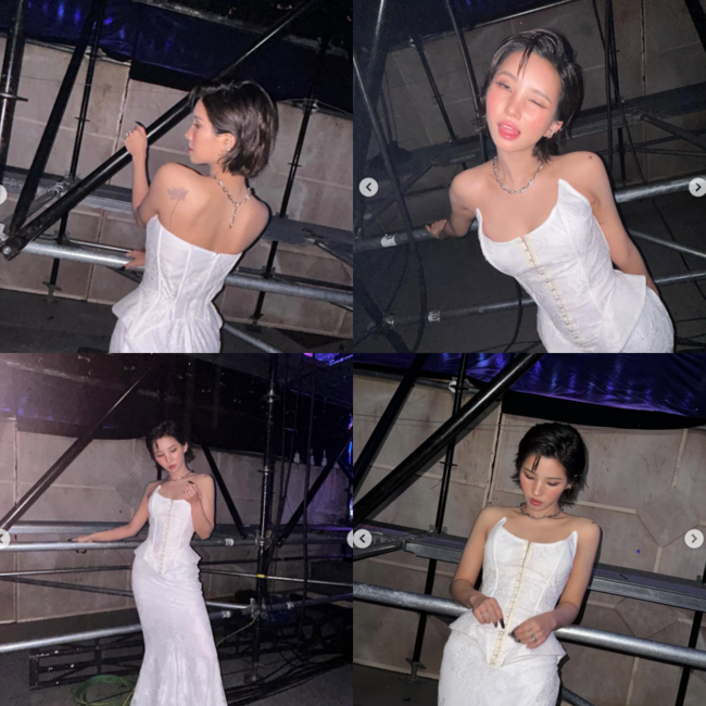 소연은 최근 개인 인스타그램을 통해 여러 장의 사진을 게재하며 근황을 전했다. 공개된 사진은 무대 뒤 공간에서 촬영된 것으로, 소연은 화이트 톤의 코르셋 디자인 롱 드레스를 입고 카메라를 응시하거나 자연스러운 포즈를 취하고 있다.