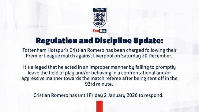 잉글랜드축구협회(FA) 공식 대변인 계정은 25일(한국시간) “로메로가 12월 20일 리버풀과의 프리미어리그 경기 이후 부적절한 행동으로 기소됐다”고 발표했다. FA는 “로메로는 93분 퇴장 이후 경기장을 즉각 떠나지 않았고, 심판에게 대립적이거나 공격적인 태도를 보였다는 혐의를 받고 있다”며 “2026년 1월 2일까지 소명해야 한다”고 밝혔다.