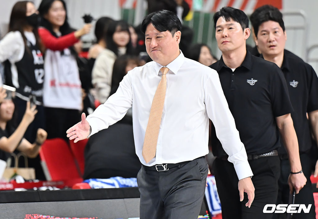 수원 KT 문경은 감독이 78-75로 승리, 역대 7번째 300승을 기록하고 울산 현대모비스 양동근 감독과 인사를 하러 가고 있다. 2025.12.27 / foto0307@osen.co.kr