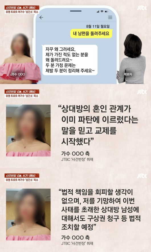 하지만 A씨는 "한 가정을 파탄 내놓고 결국 돈 때문에 봐달라니 너무 괘씸하고 기막히다"며 "유튜브 등에 B씨 행사장에 남편이 동행하는 모습이 올라오고, 결혼식장 다니면서 축가를 다닐때마다 너무 괘씸했다. 더 이상 방송에 나오는 모습을 보고 싶지 않아 제보를 결심했다"고 밝혔다.