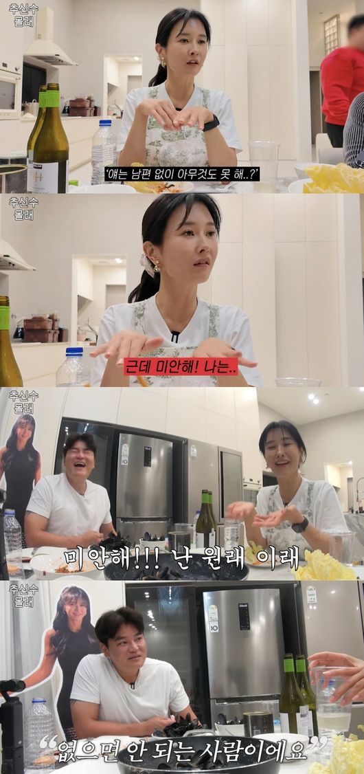 그러면서 하원미는 “사실 김장도 혼자 해야 되나 생각했다. 미안해 난 원래 이래! 난 원래 김장할 때 남편 있었어”라고 덧붙였다. 추신수는 “‘미안해’라는 단어가 원래 웃긴 단어가 아닌데 왜 이렇게 웃기냐”라고 반응했다.
