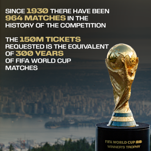 이어 FIFA는 "현재 진행 중인 랜덤 추첨 티켓팅 단계의 중간 지점에서 월드컵 역사상 가장 높은 수요를 나타내는 수치가 기록됐다. 200개국 이상의 팬들로부터 1억 5000만 장 이상의 티켓 요청이 접수됐다. 이는 이미 기존 기록을 넘어섰다"라고 전했다.