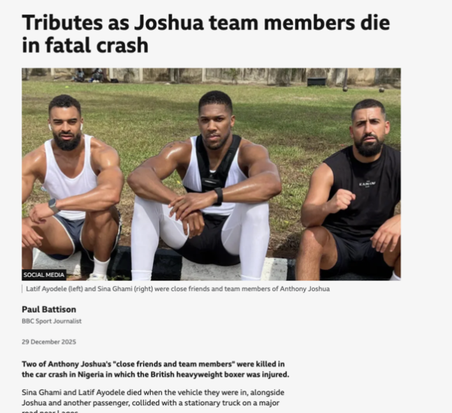 '전 헤비급 챔피언' 앤서니 조슈아(36)의 운전기사가 나이지리아 교통사고로 2명이 사망한 사건과 관련해 기소됐다.