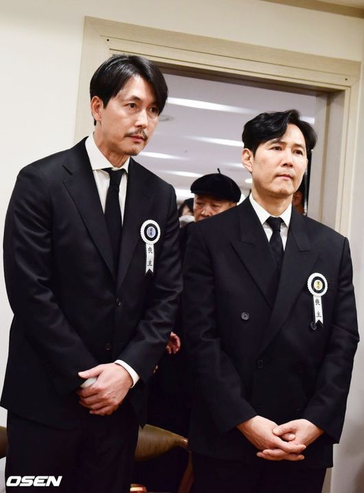배우 정우성과 이정재가 고(故) 안성기의 빈소에서 조문객을 맞이하며 고인의 마지막 길을 함께 하고 있다.