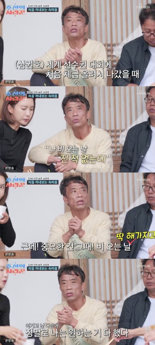 심권호는 “나 비 오는 날 무패다”라고 자신감을 드러냈다. 이어 “세계 선수권 대회에 처음 체급 올려서 나갔다. 스웨덴에서 하는데 갑자기 비가 왔다. ‘비 오는 날 진 적 없는데’ 했다. 이기고 난 다음에 정말로 나는 원하는 거 다 했다, 싶어서 너무 기뻤다”라고 말했다.