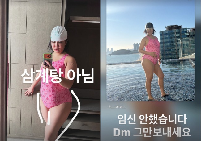 특히 화제를 모았던 것은 랄랄의 달라진 몸매였다. 이어 랄랄은 “삼계탕 아님”이라는 설명과 함께 또 다른 수영복 사진을 공개했고, 또 “임신 안 했습니다. DM 그만 보내세요”라고 해명도 전했다.