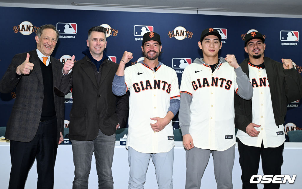 샌프란시스코 래리 베어 CEO, 버스터 포지 사장, 토니 비텔로 감독, 이정후, 윌리 아다메스가 기념촬영을 하고 있다. 2026.01.07 /sunday@osen.co.kr