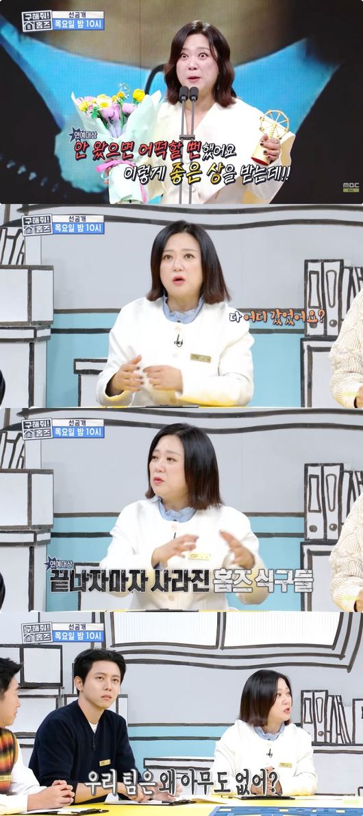 최우수상 수상 후 소감에서 박나래를 언급했던 개그우먼 김숙이 ‘구해줘! 홈즈’ 멤버들에게 섭섭함을 토로했다. 수상 후 자신만 홀로 남겨졌던 것.