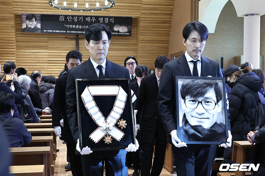 배우 정우성, 이정재가 영정과 금관문화훈장을 들고 운구 행렬과 영결식장을 나서고 있다. 2026.01.09 / photo@osen.co.kr