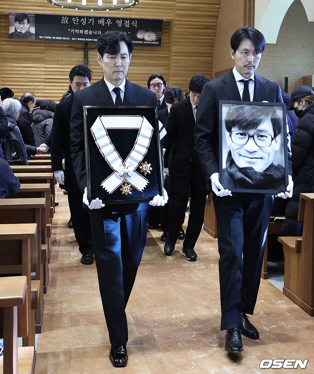 배우 정우성, 이정재가 영정과 금관문화훈장을 들고 운구 행렬과 영결식장을 나서고 있다. 2026.01.09 / jpnews@osen.co.kr