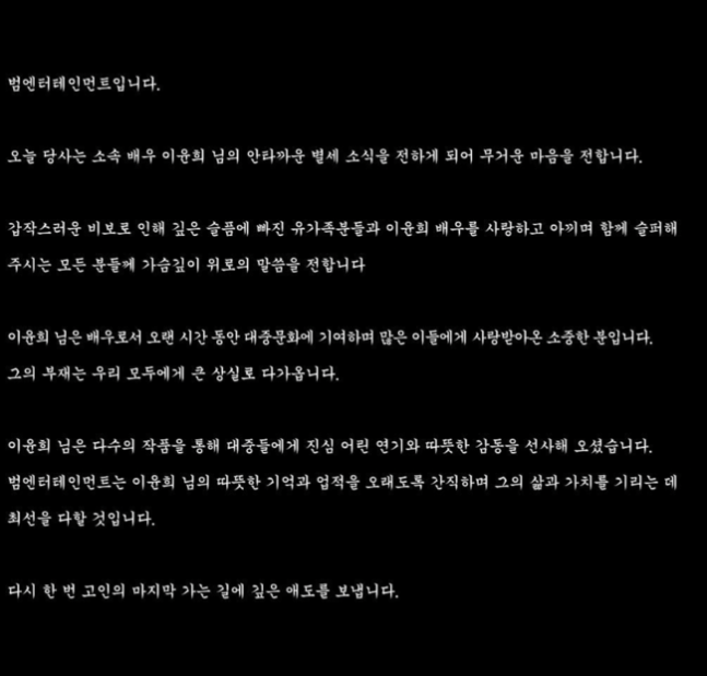 이어 "이윤희 님은 배우로서 오랜 시간 동안 대중문화에 기여하며 많은 이들에게 사랑받아온 소중한 분”이라며 “그의 부재는 우리 모두에게 큰 상실로 다가옵니다"라고 황망한 심경을 드러냈다.