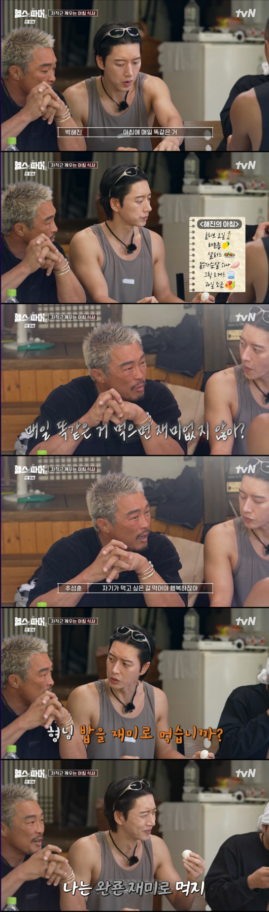 이를 들은 ‘파이터’ 추성훈은 믿기지 않는다는 듯 “매일 똑같은 거 먹으면 재미없지 않아? 자기가 먹고 싶은 걸 먹어야 행복하잖아”라며 의문을 제기했다. ‘먹는 행복’을 인생의 낙으로 삼는 추성훈의 입장에서는 이해하기 힘든 식단이었던 것.
