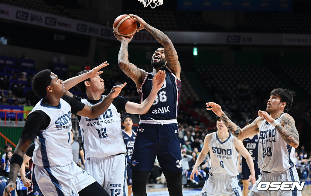 부산 KCC 숀롱이 고양 소노 강지훈의 마크를 피해 골밑슛을 시도하고 있다. 2026.01.12 / foto0307@osen.co.kr