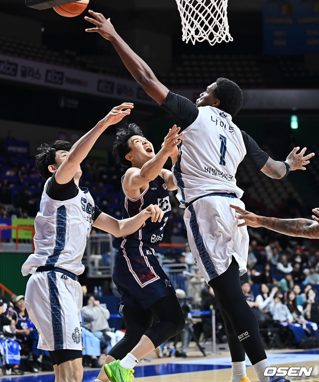부산 KCC 허웅이 고양 소노 네이던 나이트의 마크를 피해 골밑슛을 시도하고 있다. 2026.01.12 / foto0307@osen.co.kr