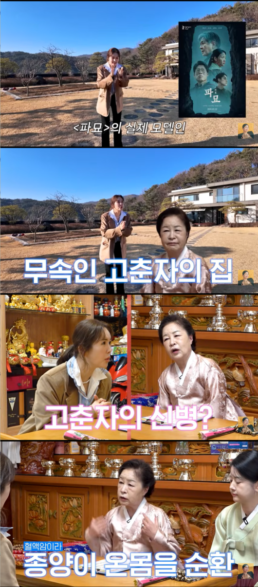 방송인 장영란이 최근 영화 '파묘'의 실제 모델로 알려진 40년 경력의 베테랑 무속인 고춘자의 집을 방문했다.