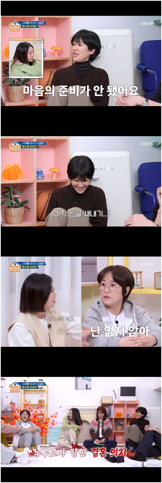 그러나 재혼 생각은 없다는 황신혜. 황신혜는 “나도 재혼 생각은 없다. 결혼 생각 없다. 내 싱글 라이프를 부러워하는 친구들도 많다”라고 말했다. 딸과 함께 자매처럼, 딸의 친구들과도 어울리며 살아가는 황신혜의 60대 라이프는 건강하고 밝아보였다. 이에 대해 공감하는 분위기가 무르익자 황신혜는 돌연 “그럼 진경이는 어때? 결혼 생각 없어?”라고 홍진경에게 물었다.