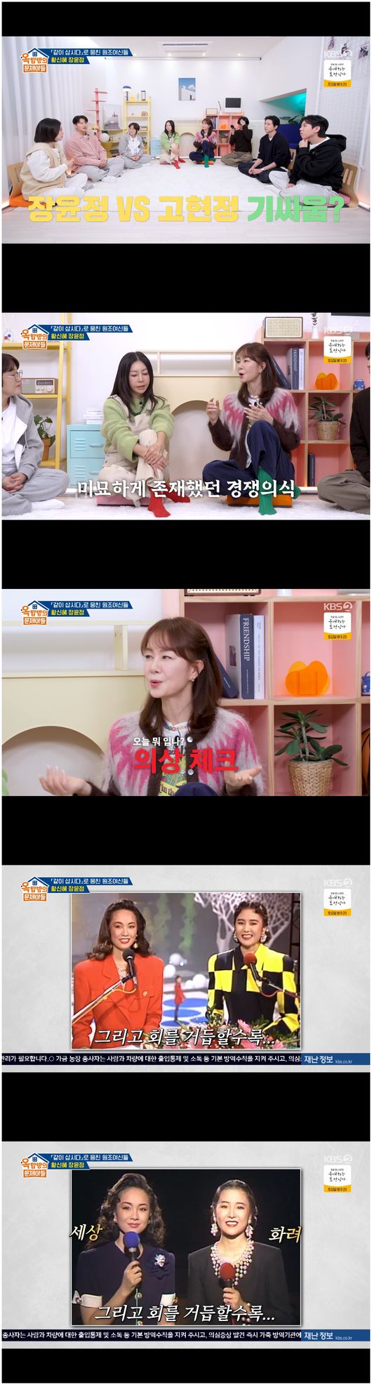 김숙은 “그때 기싸움 같은 건 없었냐”라며 짓궂게 물었다. 장윤정은 “당연히 경쟁 의식은 있었다. 그런데 그게 나쁜 건 아니다. 오히려 더 발전하지 않냐. 둘 다 미스코리아니까 의상을 신경 썼다”라며 명쾌하게 말하며 고현정과 자신의 이미지를 함께 건강하게 챙겼다. 장윤정은 “슬쩍 고현정을 보고 내가 부족한가 싶으면 얼른 들어가서 더 걸치고 나왔다. 옷이 점점 더 과해지고 화려해졌다”라며 수줍게 웃었다.