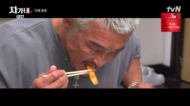 완성된 김치를 가져온 차승원은 추성훈에게 건네며 “나무 젓가락으로 먹어. 침 자꾸 묻히지 말고”라고 당부하며 철저한 위생 관념을 보였다. 김치 냄새를 맡은 추성훈은 “오 냄새 좋은데?”라며 감탄했고, 김치를 맛본 뒤 “와 여기 맛이네요”라며 태국의 맛이 난다는 극찬을 아끼지 않았다. 이어 추성훈은 “(시간) 조금 더 있으면 더 맛있을 것 같아요”라며 기대감을 드러냈다.