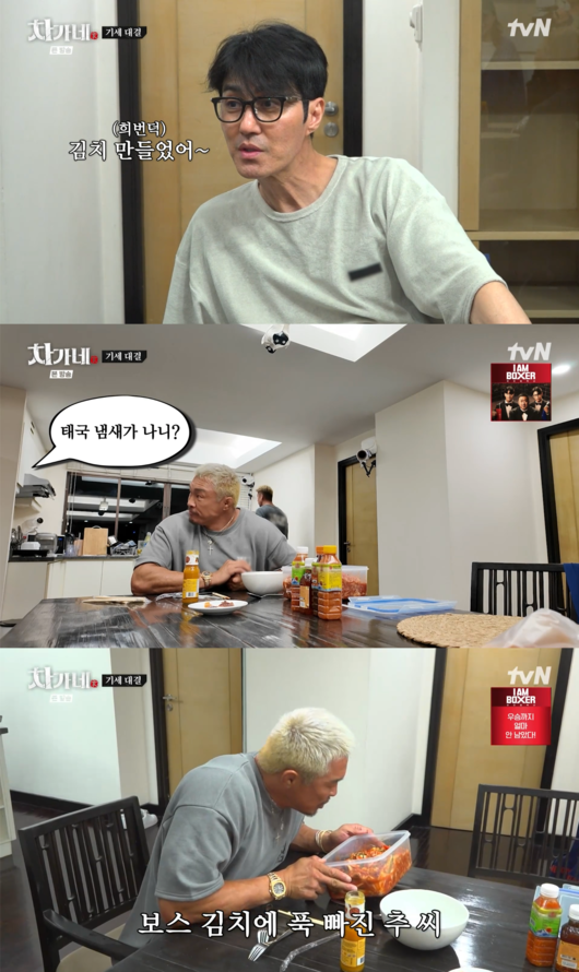 추성훈은 차승원을 향해 “형은 뭐 하셨어요?”라고 물었고, 차승원은 “김치 만들었어”라고 답하며 요리 실력을 자랑했다. 차승원은 한국 식재료 대신 태국 현지의 피쉬소스를 넣어 김치를 완성하는 특별한 손맛을 발휘한 것.
